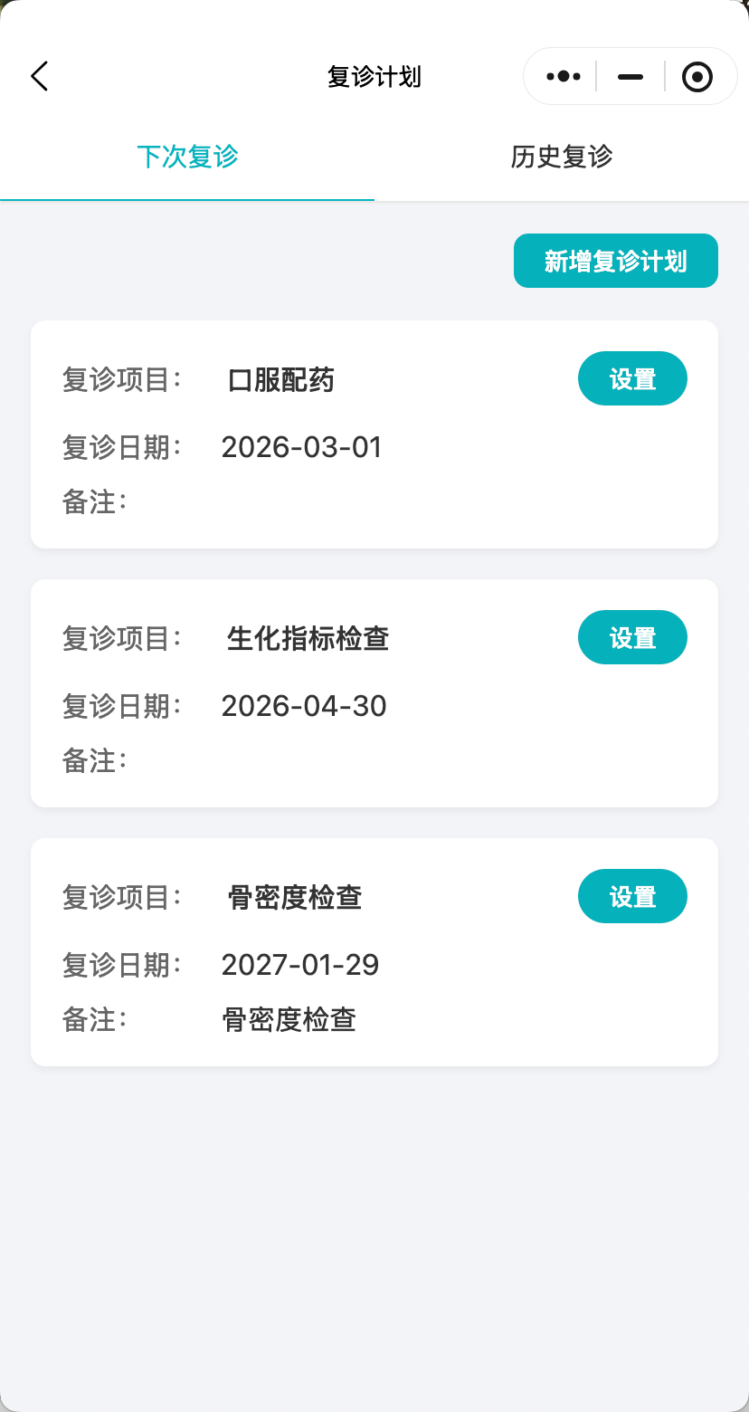 自动生成复诊计划和用药计划,到点提醒,帮助医生提升患者依从性